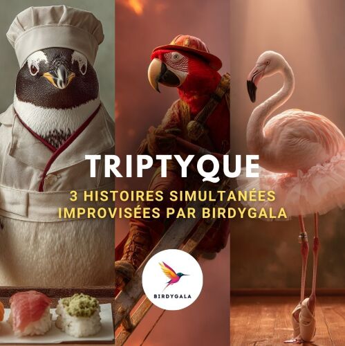Display mapDans ce format long d’improvisation, les comédiens et comédiennes de Birdygala reçoivent trois invités pour créer 3 histoires, les faire évoluer et s’entrelacer durant 1 heure, sans se rencontrer. Résultat ? On prend le temps de découvrir trois binômes de personnages, s’y attacher, être émus ou surpris, sans jamais se lasser.